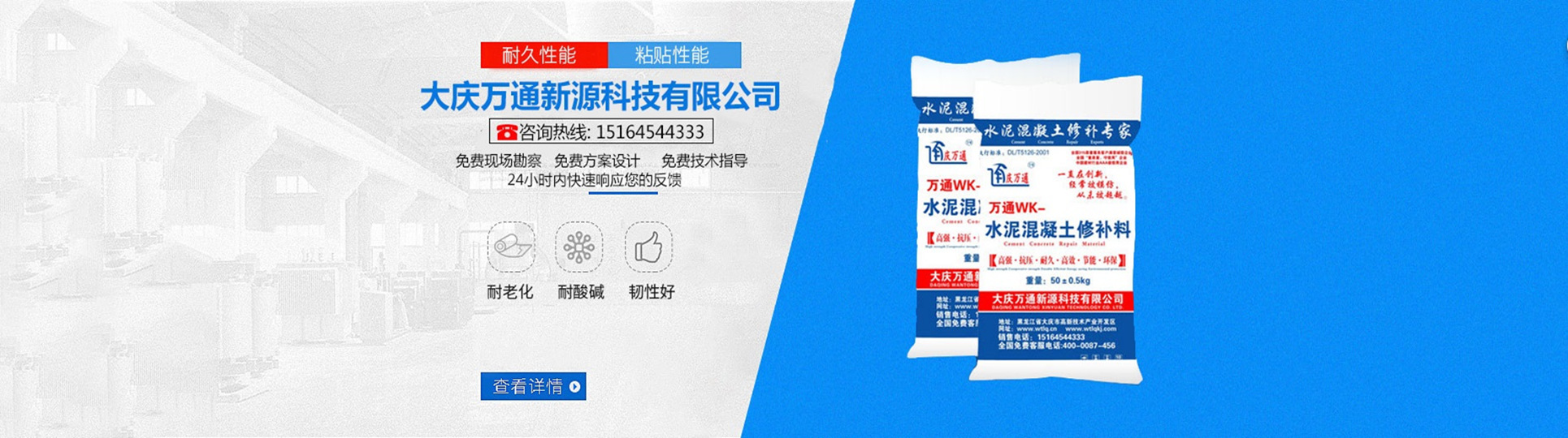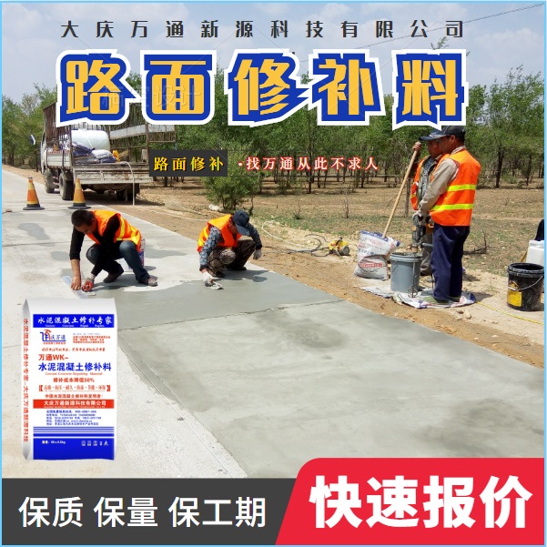 大慶萬通新源科技有限公司獨有的混凝土路面高強速補料,是水泥混凝土路面病害修復的好材料。疲勞、凍融循環(huán)、彎曲壓力、滲水和基層破壞等原因都會引起水泥路面的破損,從而帶來高昂的維護費用。與以往的剛性修補方法不同,混凝土水泥路面維修速補膠提供了一種獨特的柔性修補產品和技術,高柔性、高抗拉性,可跨伸縮縫施工和高抗壓性使得混凝土快補產品為水泥混凝土路面提供了******性的修補。傳統的剛性修補方案,如環(huán)氧砂漿和快干水泥產品,由于其自身的粘結失效,抗疲勞性低以及與原路面不同的伸縮系數,修補面會在短時間內失效或產生新的裂縫,需要反復修補,有效期短且費用高昂。大慶萬通新源科技有限公司的混凝土水泥路面維修速補膠可以隨原路面一起伸縮,移動,從而避免了粘結失效和產生新裂縫。萬通快補產品優(yōu)異的粘結性、柔韌性和高防滑性,特別適用于水泥路面的淺層粘合修補,多邊角混凝土板層修補,跨伸縮縫修補以及路面沉陷修補。萬通混凝土病害修補料針對混凝土起皮起沙、斷板裂縫、蜂窩麻面、坑槽露石子、漏筋掉皮、橋梁的掉皮漏筋快速通車使用時間長。應用萬通快補產品,施工后一天就可以恢復交通。大慶萬通新源科技有限公司的萬通水泥路面維修速補膠適用于高速公路、機場路面、農村村村通路面、廠坪、學校操場、市區公路、小區路面、橋梁、水泥路面的修補。使用萬通特快補材料修補路面可以一勞永逸! 水泥地面起砂怎么辦,混凝土修補劑混凝土地面起砂,混凝土地面修補,地面起砂怎么辦,
